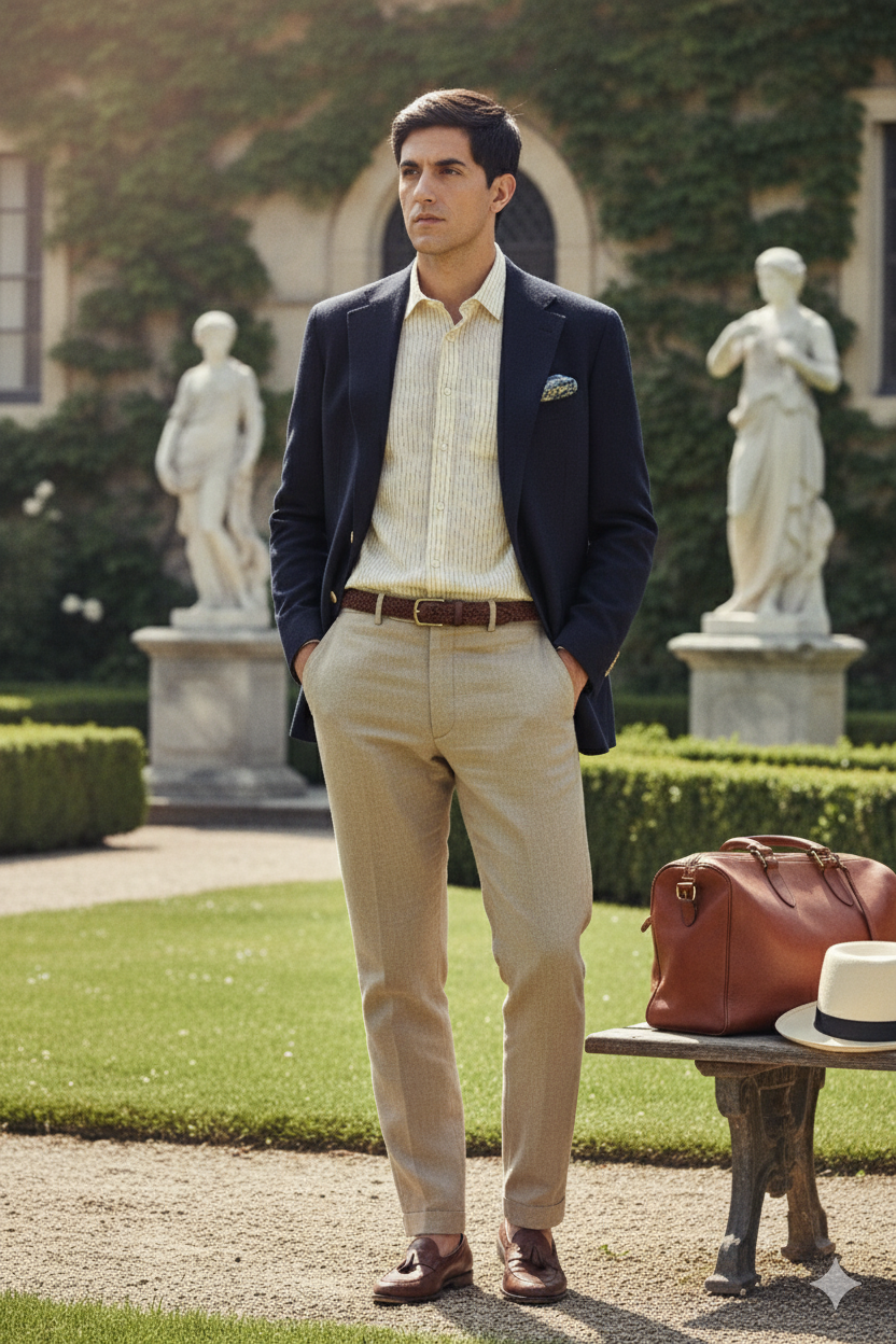 A sandal and black slub cotton striped old money outfit radiates refined simplicity and heritage charm. The subtle contrast of earthy tones paired with the textured slub cotton fabric adds depth and character, embodying effortless sophistication. It’s the perfect blend of comfort, class, and timeless elegance — true to the old money aesthetic.